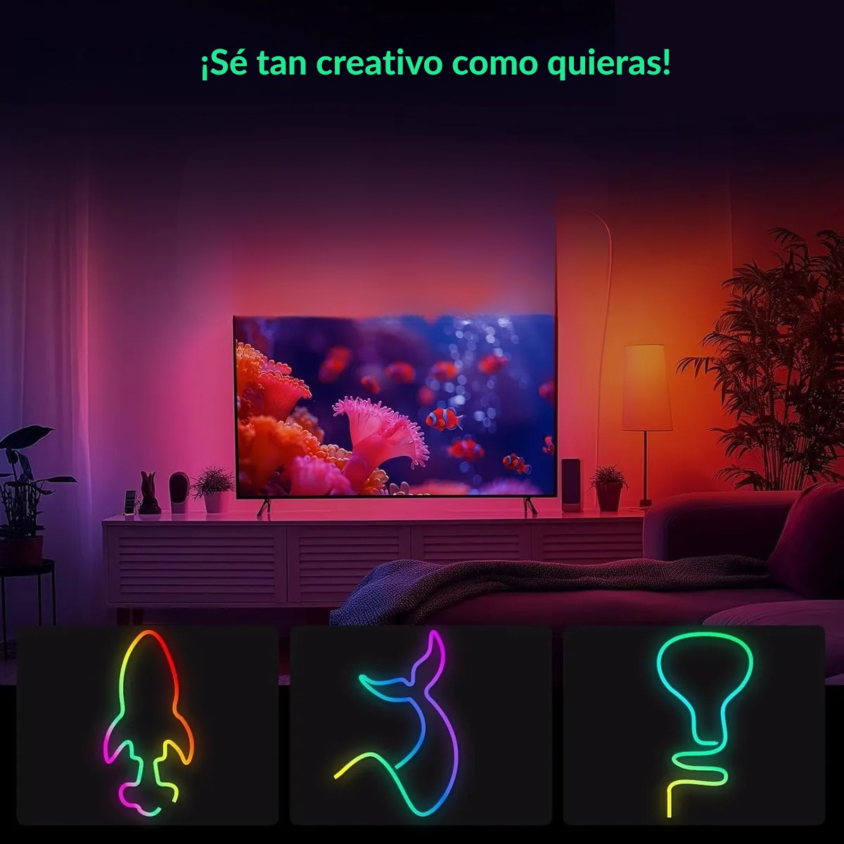 Su diseño de manguera/neón permite colocarla en curvas, esquinas y contornos, adaptándose a cualquier estructura. Incluye control remoto o app, múltiples colores y modos de iluminación, y es ideal para crear ambientes dinámicos, acogedores o de fiesta.